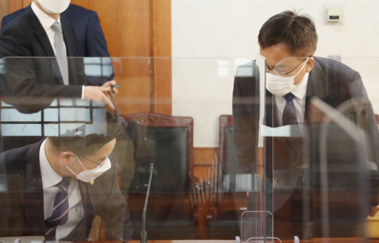 조남관(오른쪽) 검찰총장 직무대행이 19일 오전 정부서울청사에서 열린 부동산 투기 의혹 수사협력 관련 회의에 참석하며 김창룡 경찰청장과 인사하고 있다.