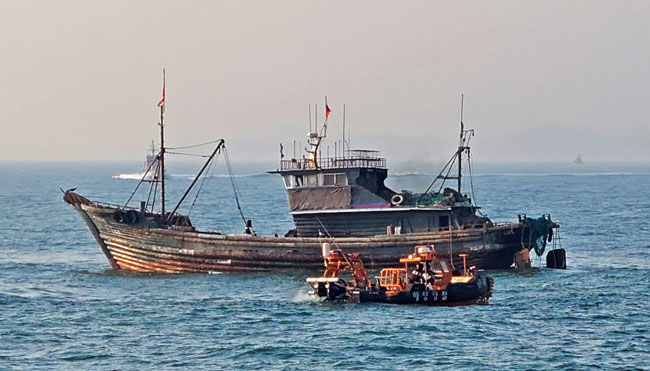 서해5도특별경비단 소속 경비정이 19일 오후 인천 옹진군 연평도 인근 남서방 27㎞ 해상에서 북방한계선(NLL)을 6㎞ 침범해 불법조업한 혐의로 중국 목선 1척을 나포하고 있다.