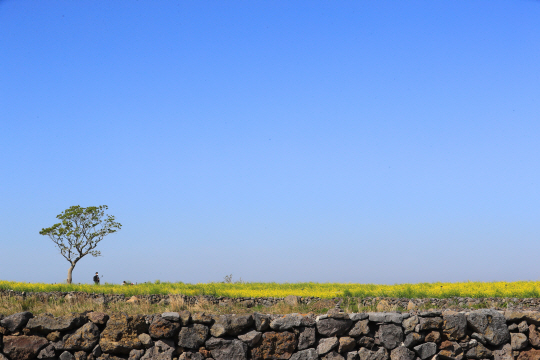20일 오전 제주 서귀포시 안덕면의 한 유채밭을 찾은 관광객이 봄 정취를 즐기고 있다.