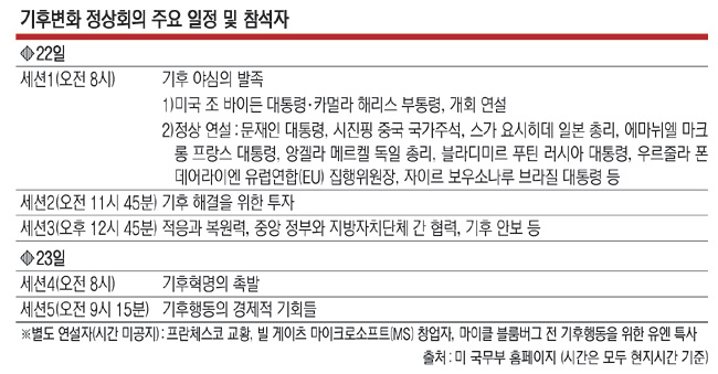 첫날 예정된 1세션에서는 문 대통령을 포함해 시 주석과 스가 요시히데(菅義偉) 일본 총리, 블라디미르 푸틴 러시아 대통령, 에마뉘엘 마크롱 프랑스 대통령, 앙겔라 메르켈 독일 총리, 보리스 존슨 영국 총리, 자이르 보우소나루 브라질 대통령 등 27개국 정상의 연설이 줄줄이 예정돼 있다. 이후 △기후 금융의 확장과 민간 투자의 확대 △기후 변동성에 대한 적응력 △중앙 정부와 지방자치단체 간 협력 △기후 안보 △기술 혁명 등을 주제로 한 별도 세션도 열린다.