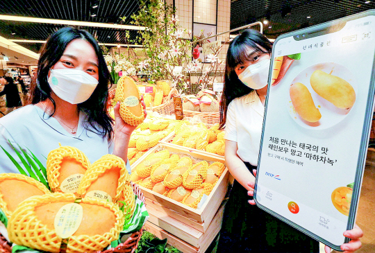 25일 서울 강남구 현대백화점 식품관 직원들이 주한태국대사관 상무관실과 협력해 올해 처음 국내에 들여온 ‘레인보우 망고’를 소개하고 있다.
