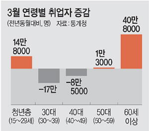 통계청이 지난 14일 내놓은 ‘고용동향’(2021년 3월)에 따르면, 지난달 취업자는 2692만3000명으로 1년 전 같은 달과 비교해 31만4000명 늘었다. 지난해 3월부터 12개월 연속 감소세였던 데서 반등에 성공했지만, 속내를 들여다보면 여전히 암울하다. 지난해 3월 취업자 수가 큰 폭으로 줄어든 데 따른 ‘기저 효과’ 영향이 컸다. 더구나 고용시장의 중추라 할 수 있는 30대는 17만 명, 40대는 8만5000명 각각 감소했다. 정부의 재정(국민 세금) 일자리가 대부분인 60대 이상 취업자가 40만8000명으로 크게 증가해 전체 취업자 수를 끌어올렸을 뿐이다.