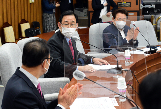 오는 30일 퇴임하는 주호영(가운데) 국민의힘 원내대표 겸 대표 권한대행이 27일 오전 국회에서 열린 마지막 원내대책회의에서 모두 발언을 한 뒤 박수를 받고 있다. 왼쪽부터 이종배 정책위의장, 주 원내대표, 정양석 사무총장.