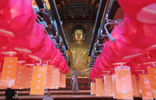 11일 오전 서울 종로구 조계사 대웅전에서 스님들이 부처님오신날(5월 19일) 맞이 대청소를 하며 불상의 먼지를 털어내고 있다.