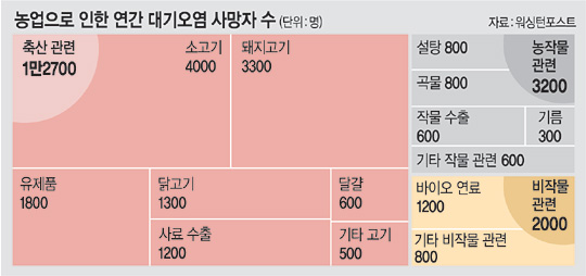 10일 워싱턴포스트(WP)에 따르면 제이슨 힐 미네소타대 교수 연구팀은 이날 미국 국립과학원회보에 게재한 보고서에서 미 전역의 농가에서 발생하는 암모니아, 초미세먼지(PM 2.5) 등 대기오염 물질로 연간 1만7900명이 사망한다고 밝혔다. 석탄 화력발전소에서 발생하는 오염물질에 따른 사망자보다 많다. 특히 축산 분야와 관련한 사망자가 1만2700명으로 전체의 70.9%를 차지했다. 소고기 생산에서 발생한 오염물질로 4000명이 숨졌고, 돼지고기 3300명, 유제품 1800명, 닭고기 1300명, 달걀 600명 등이었다. 작물 생산에서 발생하는 대기오염으로는 3200명이 사망하는 것으로 추산됐고, 비작물 생산 분야 대기오염 사망자는 2000명이었다.