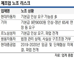 11일 제조업계에 따르면 임금 및 단체협상(임단협) 시즌을 맞아 현대자동차 노조는 호봉 자동 승급분을 현행 2호봉에서 3호봉으로 늘릴 것을 요구할 것으로 알려졌다. 1인당 호봉승급 금액 자체는 크지 않다. 그러나 매년 누적되면 기본급 기준을 높이고 특근과 잔업, 연월차 수당까지 덩달아 증가하게 돼 기업 부담이 클 수밖에 없다. 노조는 이에 더해 금속노조의 지침에 맞춰 기본급 월 9만9000원 인상도 요구할 것으로 전해졌다. 기아 노조는 기본급 월 9만9000원 인상과 정년 65세 연장, 영업이익의 30%를 성과급으로 지급하라는 내용의 요구안 초안을 작성한 것으로 전해졌다. 르노삼성자동차 노조는 무기한 파업 중이다. 노조는 회사가 부분 직장폐쇄를 하고 근로희망서를 받자 부당노동행위라고 압박하고 있다. 회사 측은 이에 대해 파업 참가자만을 대상으로 부분 직장폐쇄를 했기 때문에, 파업 미참가자를 구분하기 위해 근로희망서를 받는 것이라는 입장이다. 회사는 직장폐쇄의 연계선상에서 근로희망서 작성의 위법성을 판단해야 하며, 직장폐쇄의 실효성 확보를 위한 적법한 조치로 판단하고 있다고 밝혔다. 르노삼성차 관계자는 “조합원의 약 25%인 파업 참가자들이 공장에서 집회를 열면서 정상 조업자의 업무를 방해하고 있다”고 말했다. 현대중공업도 2년 치 임단협을 마무리하지 못한 상황에서 노조가 파업 등을 이어가고 있다.