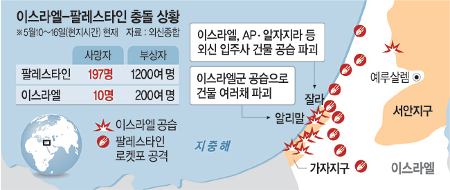AP통신에 따르면 이스라엘군은 이날 새벽 가자지구 전역에서 강도 높은 폭격을 감행했으며, 이는 42명의 사망자를 낸 전날의 공습보다 더 긴 시간 이어졌다. 피해 상황은 아직 알려지지 않았다. 지난 10일 이스라엘과 가자지구 무장정파 하마스 간 충돌이 시작된 이후 지금까지 가자지구에선 197명, 이스라엘에선 10명이 사망했다. 부상자도 1400여 명에 달하며, 4만 명 이상의 이재민도 발생했다.