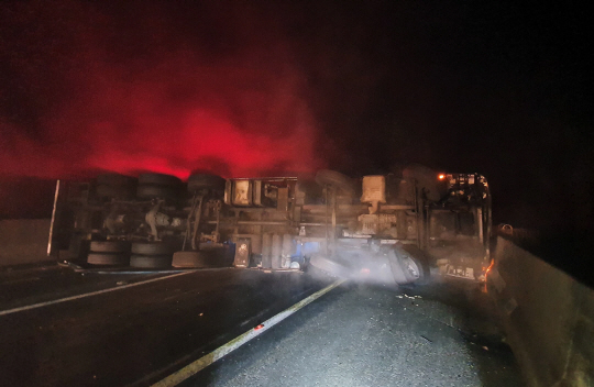 24일 오전 3시 6분쯤 충남 보령시 청소면 서해안고속도로 상행선에서 염산을 실은 탱크로리가 전복돼 소방대원들이 현장 수습을 하고 있다.