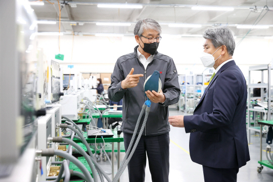 윤종원(사진 오른쪽) 기업은행장이 혁신 중소기업 및 영업점들을 방문하면서 현장 소통 행보를 이어가고 있다. 기업은행은 윤 행장이 23일 경기 파주시에 있는 인공호흡기 제조 기업 ‘멕아이씨에스’를 방문해 이 회사 김종철(〃 왼쪽) 대표로부터 생산공정에 관해 설명을 듣고 금융 애로 사항들을 청취했다고 24일 밝혔다.