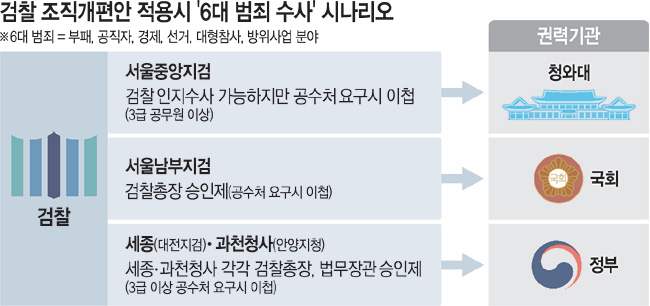이번 검찰 조직개편안이 다음 달 국무회의를 통과할 경우 향후 청와대, 국회, 정부 등 권력기관을 향한 수사 지형도 크게 바뀔 전망이다. 예컨대 법무부가 있는 과천청사 사건을 관할하는 안양지청은 ‘과천발 6대 범죄’를 수사하려면 법무부 장관의 승인을 받아야 수사가 가능하다. 이럴 경우 법무부 장관이 법무부 범죄에 대한 수사개시를 ‘셀프 승인·거부’하는 시나리오도 가능하다. 개편안에는 서울중앙지검은 6대 범죄를 반부패·강력수사부 등 전담부서에서만, 기타 지방검찰청은 형사 말(末)부 1개 부서에서만 검찰총장의 승인을 얻어 수사하도록 했다. 규모가 작은 지청에서는 총장의 요청과 법무부 장관의 승인을 얻은 후에야 임시 수사조직을 설치해 수사할 수 있도록 했다. 국회와 정부세종청사를 각각 담당하는 서울남부지검과 대전지검은 6대 범죄 수사 진행 시 검찰총장 승인을 받아야 수사를 개시할 수 있다.