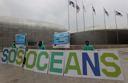 ‘2021 P4G 서울 녹색미래 정상회의’ 개막을 이틀 앞둔 28일 오전 서울 중구 동대문디자인플라자(DDP) 앞에서 환경단체 그린피스 활동가들이 기후변화 대응을 위해 공해(公海) 30% 보호구역 지정 선언을 촉구하는 시위를 벌이고 있다.