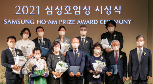1일 오후 서울 중구 신라호텔 영빈관에서 열린 ‘2021 삼성호암상 시상식’에서 수상자들과 호암재단 관계자가 기념촬영을 하고 있다. 앞줄 왼쪽부터 사회봉사상 이석로 꼬람똘라병원 원장 가족(대리수상)·공학상 조경현 미국 뉴욕대 교수 가족(대리수상)·의학상 이대열 미 존스홉킨스대 특훈교수 가족(대리수상)·김황식 호암재단 이사장, 뒷줄 왼쪽부터 과학상 물리·수학부문 허준이 미 스탠퍼드대 교수 부부, 과학상 화학·생명과학부문 강봉균 서울대 교수 부부, 예술상 봉준호 영화감독.