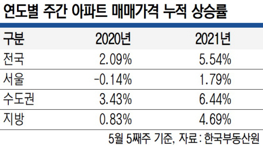 4일 한국부동산원의 주간아파트 가격동향에 따르면 5월 5째주 기준, 올해 전국 아파트 매매 가격 누적 상승률은 5.54%로 지난해 동기(2.09%)대비 2배를 웃돌았다. 지난해 -0.14%의 누적 상승률을 기록했던 서울도 올해는 이미 1.79%가 오른 상태다. 반년도 안 돼 지난해(0.86%, 2020년 12월 28일 기준) 오른 것보다 2배 이상 오른 셈이다.