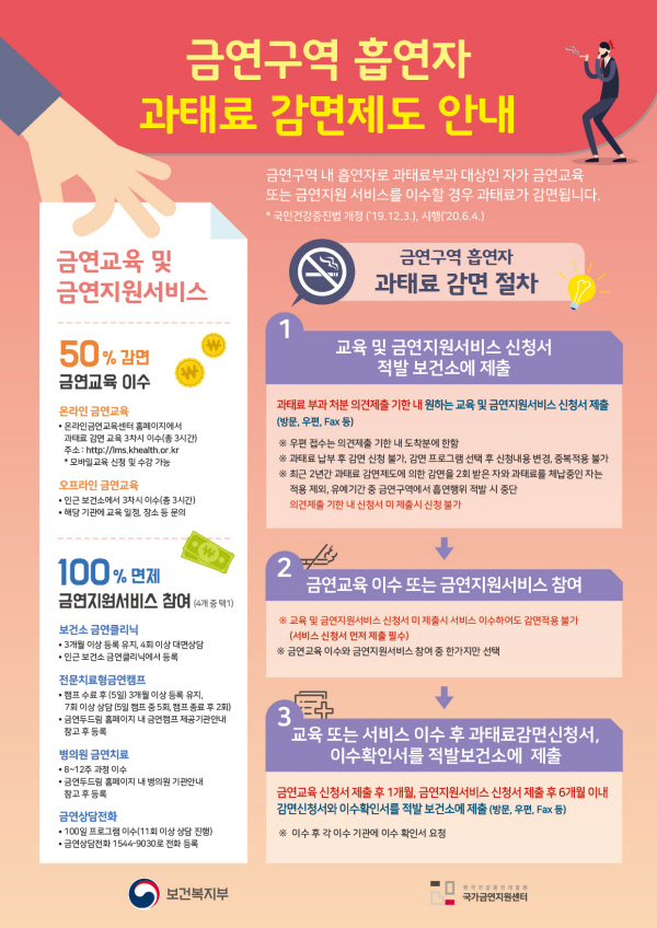 4일 보건복지부와 한국건강증진개발원은 ‘흡연 과태료 감면제도’ 시행 1주년을 맞아 참여현황을 분석한 결과 총 8824명이 참여해 5393명이 과태료 감면 혜택을 받았다고 밝혔다. 흡연 과태료 감면제도는 금연구역에서 흡연하다 적발되면 10만 원 이하의 과태료를 부과받지만, 금연교육이나 금연지원서비스를 받으면 과태료를 감면해주는 정책이다. 금연교육을 이수하면 과태료의 50%를 감경하고, 지정된 금연지원서비스를 이용하면 100%를 면제해준다. 2019년 12월 3일 국민건강증진법 개정으로 지난해 6월 4일부터 시행됐다.