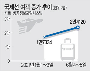 국제선 여객 수요는 침체를 딛고 활력을 되찾고 있다. 항공정보포털시스템 공항별·노선별 운송실적에 따르면 본격적인 여름 성수기가 시작된 6월 첫 주 주말(4~6일) 국제선(출발·도착 포함) 여객 수는 2만4120명으로 집계됐다. 이는 올해 1월 첫 주 주말(1~3일) 국제선 여객 수 1만7334명보다 6786명 많은 수준이다. 지난해 같은 시기(2020년 6월 5~7일) 2만584명보다도 3500명가량 늘었다.