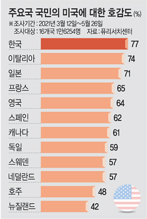국가별로는 한국에서 ‘미국에 우호적’이라는 답변이 77%로 가장 높았다. 이어 이탈리아(74%), 일본(71%), 프랑스(65%), 영국(64%) 등 순이었다. 한국인의 대미 호감도는 버락 오바마 전 대통령이 재임 중이던 2015년 84%로 최고치를 기록했으나 트럼프 전 대통령 취임 이후 하락했다. 트럼프 전 대통령이 한국의 방위비 분담금 규모와 한·미 자유무역협정(FTA) 등을 문제 삼는 행보를 보여왔기 때문으로 분석된다. 반면 바이든 대통령이 동맹 강화와 리더십 회복을 내세우고 한·미 동맹을 중시하면서 대미 호감도가 상승 반전한 것으로 해석된다.