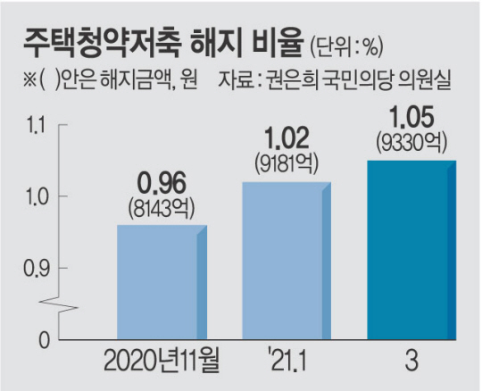 서울 양천구에서 ‘전세살이’를 하고 있는 김미진(34) 씨는 지난해 말 7년 동안 부어왔던 주택청약저축을 해지하고 그 돈을 주식시장에 투자했다. 김 씨는 “미혼인 데다, 혼자 살고 있어 청약 가점도 높지 않아 주택청약을 계속 부어봐야 서울에서 아파트 장만은 꿈도 못 꿀 상황이라 차라리 주식시장에 투자하는 게 낫다 싶어 통장을 해지했다”며 “지난해 말 주식시장에 들어갔는데 아직까지 수익률은 나쁘지 않은 편”이라고 말했다.
