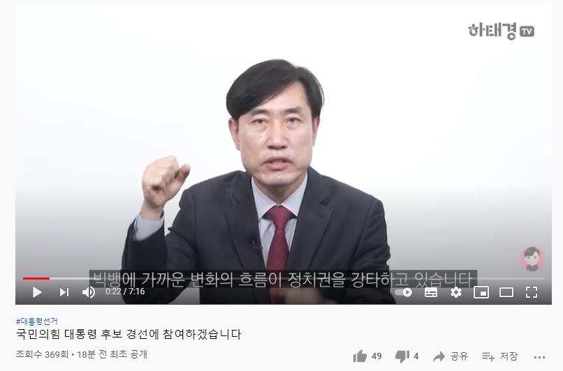 3선의 하 의원은 이날 SNS를 통해 생중계한 기자회견에서 “도도한 변화의 흐름에 담긴 민심의 요구는 시대교체다”라며 대선 경선에 참여하겠다고 밝혔다.