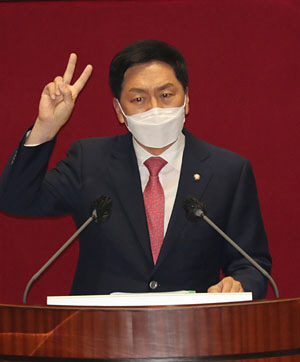 김 원내대표는 이날 국회 본회의장에서 “민주화를 성취한 세계 11위 경제대국임에도 불구하고 국민의 삶은 점점 힘겨워지고 있다”며 현 정부의 일자리와 부동산, 백신 정책 실패를 강하게 비판했다. 그는 “국민은 얼마나 노력해야 일자리를 얻을 수 있고 얼마나 걸려서, 얼마를 모아야 집을 살 수 있냐고 묻고 있다”며 “문재인 대통령과 더불어민주당은 국민의 질문 앞에 제대로 답을 한 적이 있는가”라고 지적했다. 김 원내대표는 “소득주도성장이 경제 폭망의 시작이었다”며 “(문 대통령과 정부의) 자화자찬 거짓말에 국민이 화병 났다”고 비판했다. 그는 청와대와 여당을 ‘꼰수기’로 부르며 “꼰수기에게 어떻게 미래를 맡기겠나. 이들이 어떻게 민생과 공정을 챙기겠나”라고 꼬집었다. 김 원내대표는 “대한민국이 586 운동권의 요새가 돼 간다”며 “한때 대한민국 체제를 뒤집으려고 했던 사람들이, 가장 많은 혜택을 누리면서 이제는 꼰대·수구·기득권이 돼 해악을 끼치고 있다”고 주장했다.