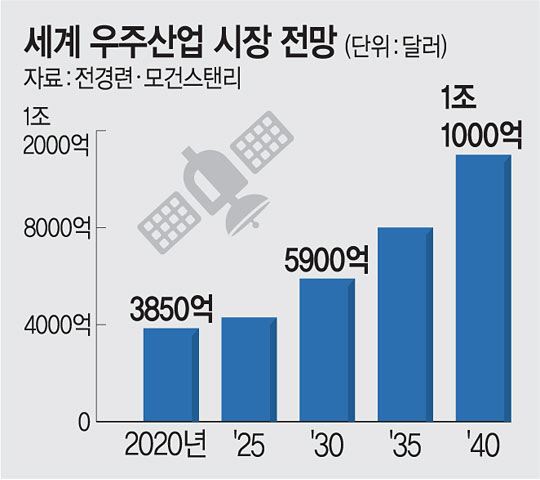 전국경제인연합회는 17일 ‘주요국 우주산업 국제비교 및 시사점’을 통해 한·미 미사일 지침 종료와 한국의 아르테미스(미국 주도의 달 탐사) 계획 참여 등으로 우주개발에 대한 기대감이 높아지고 있다며 이같이 밝혔다. 전경련에 따르면 글로벌 우주산업 규모는 지난해 3850억 달러(약430조6000억 원)에서 2040년 1조1000억 달러까지 증가할 전망이다.