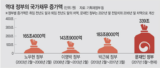 17일 문화일보가 역대 정부의 국가채무 증가액을 추산한 결과, 문재인 정부에서 국가채무는 역대 정부 중 가장 많은 339조 원이나 늘어날 것으로 전망된다. 기획재정부가 올해 1차 추가경정예산(추경)을 편성하면서 내놓은 연말 국가채무 전망치(965조9000억 원)에서 문 정부 출범(2017년 5월) 직전인 2016년 말 국가채무(626조9000억 원)를 뺀 수치다. 정부는 “신종 코로나바이러스 감염증(코로나19) 확산에 따른 경제 위기 대응 과정에서 국가채무가 늘었다”고 주장하고 있지만, 반드시 그런 것은 아니다. 코로나19가 발생하기 이전에도 문재인 정부에서 국가채무는 폭증했기 때문이다. 국가채무는 노무현 정부에서는 165조4000억 원, 이명박 정부에서는 143조9000억 원, 박근혜 정부에서는 183조8000억 원이 각각 늘었다.