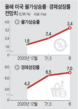 Fed가 16일(현지시간) 정례 연방공개시장위원회(FOMC) 회의 이후 내놓은 성명에서 가장 주목되는 부분은 물가상승률 전망치다. Fed는 물가상승률 전망치를 지난 3월 2.4%에서 3.4%로 1%포인트나 올려 잡았다. Fed는 경제성장률 전망치 역시 기존 6.5%에서 7%로 상향했다. 제롬 파월 Fed 의장도 이날 기자회견에서 “인플레이션이 예상했던 것보다 더 높게 오래 지속될 가능성이 커지고 있다”고 밝혔다. 이에 따라 Fed는 이날 성명에서 3, 4월 성명에 포함됐던 “코로나19로 인해 미국에 경제적 어려움이 야기되고 있다”는 표현도 삭제했다.