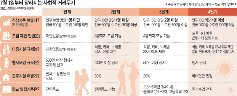 새 거리두기에서는 사적모임 인원과 다중이용시설 운영 제한이 크게 완화되는데 수도권의 경우 유흥시설이 수개월 만에 영업을 재개하고, 식당·카페·노래방·헬스장 등의 영업시간은 현행 밤 10시에서 12시로 2시간 늘어난다. 사적모임 가능 인원은 현재 4명(5인 이상 금지)에서 첫 2주간(7월 1∼14일)은 6명(7인 이상 금지)으로, 그 이후에는 8명(9인 이상 금지)으로 확대된다. 비수도권에서는 인원 제한이 없어 대규모 모임·회식이 가능해진다.