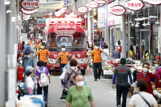 24일 광주 북구 말바우시장에서 북구청, 북부소방서 등 관계 기관이 합동으로 소방통로 확보 훈련을 하고 있다.