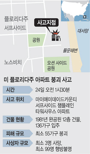 고요한 새벽 시간 미국 플로리다주 남부 마이애미데이드카운티 서프사이드에서 해변으로부터 약 3마일, 시내로부터 약 10마일 떨어져 있는 챔플레인 타워사우스 아파트 일부가 붕괴했다. 중앙 부분이 먼저 무너지고 9초 후 나머지가 붕괴하면서 약 30초 만에 해변 쪽 귀퉁이가 모두 주저앉았다. 건물 벽이 마치 폭포처럼 흘러내리면서 침대, 탁자 등 거주자들이 사용하던 물건들이 훤히 드러났고, 에어컨 등 가전제품이 전선에 위태롭게 매달려 있었다.