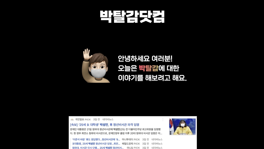 26일 웹사이트 ‘박탈감닷컴’에는 “박성민 청년비서관은 공무원의 끝판왕인 1급”이라며 “청년비서관이면 청년의 힘듦을 대변해야 하는 것 아닌가. 정당 활동 외 별다른 취업 활동도 없다”는 등의 주장이 정리돼있다.