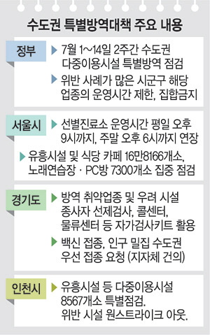 정부가 사회적 거리두기가 완화되는 7월부터 2주 동안 서울과 인천의 식당과 카페, 유흥시설 등 18만4000여 곳에 대해 지방자치단체와 특별점검에 나선다. 방역 수칙 위반 사례가 많은 시·군·구는 해당 지역 동일 업종 전체에 대해 운영시간 제한 및 집합금지 조치를 내리기로 했다. 29일 중앙재난안전대책본부(중대본)는 김부겸 국무총리 주재로 서울시, 인천시, 경기도 등 수도권 광역단체장과 함께 회의를 진행해 이러한 내용의 수도권 특별방역대책을 추진하기로 했다. 7월부터 새로운 거리두기 개편안 시행과 함께 거리두기가 완화되는 가운데, 최근 신종 코로나바이러스 감염증(코로나19) 확진자의 증가 추세와 델타 변이 바이러스의 확산 등 위협에 대한 대응으로 분석된다.