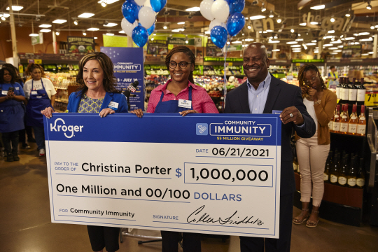 28일 미국 테네시주 저먼타운의 크로거 매장에서 첫 번째 ‘커뮤니티이뮤니티 기브어웨이’ 당첨자가 돼 100만 달러짜리 수표를 받게 된 크리스티나 포터(왼쪽 두 번째)가 콜린 린드홀츠(〃첫 번째) 크로거 헬스 회장 등과 기념촬영을 하고 있다. 대형 식품체인 크로거는 신종 코로나바이러스 감염증(코로나19) 백신 접종을 완료한 고객을 상대로 추첨, 최대 100만 달러 상금을 지급한다.