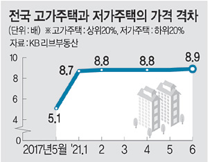 집값이 고가 주택을 중심으로 계속 오르면서 저가와 고가 주택 간 격차가 12년 만에 가장 크게 벌어진 것으로 나타났다. 하위 20% 주택의 가격은 평균 1억2000만 원가량인 반면 상위 20% 주택은 평균 11억 원을 돌파하며 자산 양극화가 심화됐다.
