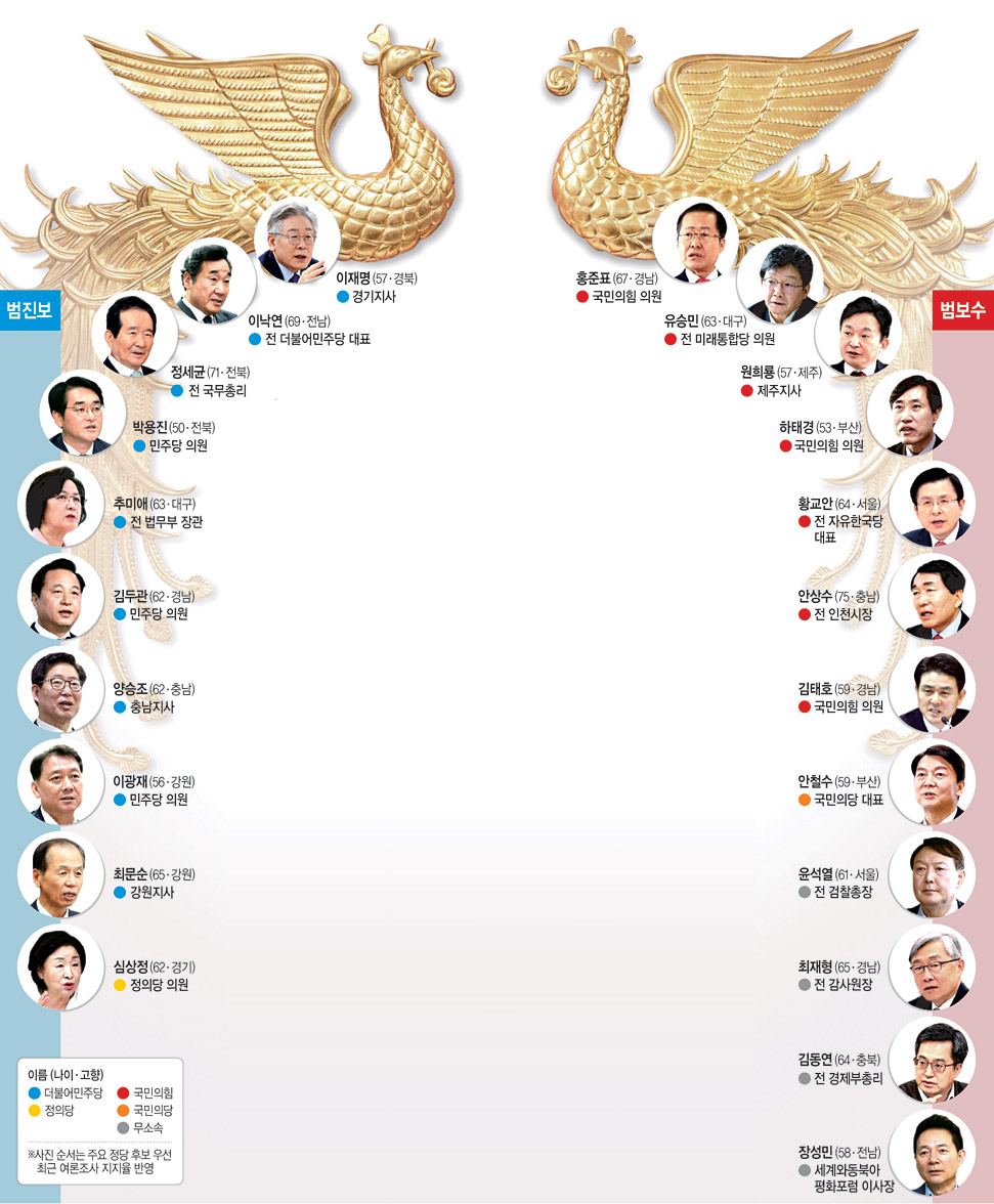 국민의힘을 비롯한 야권은 주자가 13명에 달한다. 국민의힘에서는 김태호·하태경·홍준표 의원, 유승민 전 의원, 황교안 전 대표, 원희룡 제주지사, 안상수 전 인천시장이 준비하고 있고, 안철수 국민의당 대표도 유력 주자다. 당 밖에서는 윤 전 총장, 최 전 감사원장, 김 전 부총리, 장성민 세계와동북아평화포럼 이사장이 거론된다. 1997년 신한국당 경선에 ‘9룡’이 등장한 이후 주자 수가 가장 많다. 진보 야당에서는 심상정 정의당 의원이 출마할 가능성이 높다.