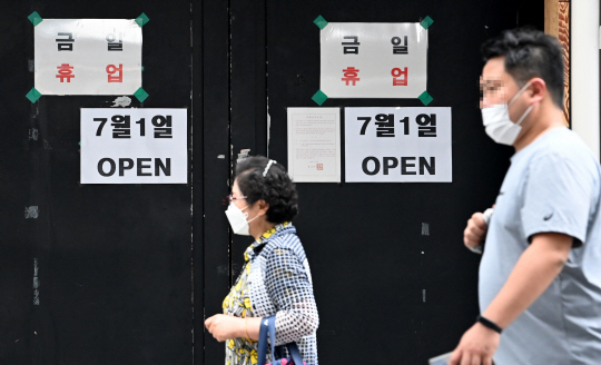 그동안 집합금지 조치가 유지됐던 수도권 유흥시설이 내달부터 완화된 사회적 거리두기 조치 적용으로 자정까지 운영이 가능해진 가운데 30일 오전 서울 종로구의 한 업소 입구에 7월 1일부터 영업 재개를 알리는 안내문이 붙어 있다.
