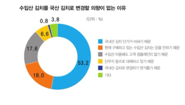 수입산 김치를 국산으로 바꾸지 않는 이유로는 53.2%가 국산 김치 단가가 비싸다는 점을 들었다. 이어 ‘현재 구매하는 수입산 김치는 믿을 만해서’(18.0%), ‘수입산을 이용해도 고객 항의가 없어서’(17.6%), ‘단무지 등으로 대체하고 있기 때문’(6.6%) 등이었다.