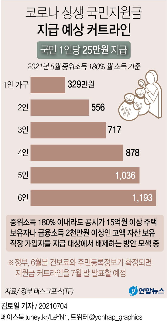 정부가 국민 1인당 25만원을 지급하는 코로나 상생 국민지원금 지급 커트라인으로 중위소득 180%를 유력하게 검토하고 있다.