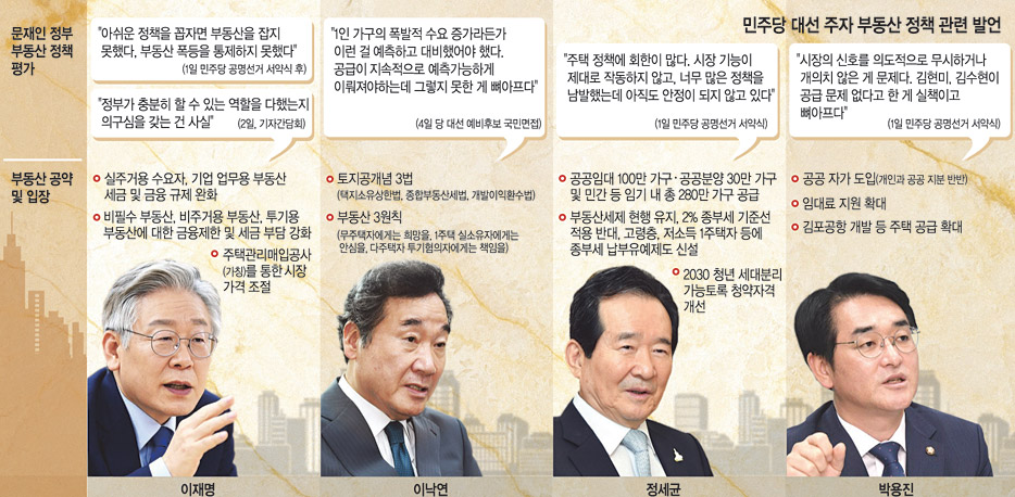 더불어민주당 대통령선거 주자들은 부동산 문제를 시장의 자율 기능에 맡기기보다는 공공의 개입, 규제 강화 등 반(反)시장주의적 정책으로 해결해야 한다고 주장하고 있다. 문재인 정부가 추진해 온 증세 등을 통한 수요 억제책이 사실상 실패했음에도 정책 기조에서 큰 차이가 보이지 않는다. 부동산에 대한 국민적 불만과 분노를 악용하고 있다는 지적이 나온다.