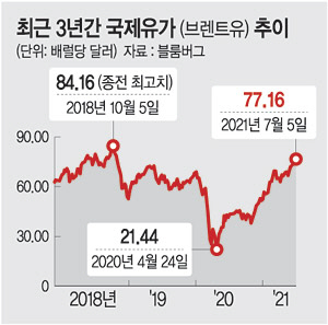 이에 따라 이날 뉴욕상업거래소(NYMEX)에서 국제유가 기준물인 북해산 브렌트유 가격이 1.3% 올라 배럴당 77.16달러를 기록했고, 서부텍사스산원유(WTI) 가격 역시 1.6% 상승해 배럴당 76.36달러를 나타냈다. 2018년 10월 이후 최고치다. 코로나19 팬데믹(세계적 대유행)을 계기로 전 세계 공급망이 타격을 입으면서 급감했던 국제유가는 올해 들어 백신 접종과 함께 세계 경제가 회복세를 보이면서 50% 가까이 오른 바 있다.