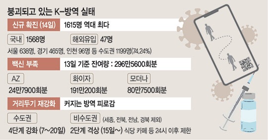 이날 국내 코로나19 환자는 지역발생 1568명, 해외유입 47명 등 1615명으로 역대 최고치를 기록했다. 정부는 그동안 사회적 거리두기와 선제적 역학조사 감염차단에 나서고 백신 접종을 통해 감염 확산을 막아왔지만 확진자가 연일 역대급으로 발생하면서 방역망 붕괴 상황으로 흐르고 있다. 확진자가 다수 발생할수록 대응 능력도 떨어지는 만큼 상황은 악화일로를 걸을 가능성이 더욱 커지고 있다. 감염경로가 불명확해 언제 어디서든 감염될 수 있고, 언제 어디서 걸렸는지도 알기 힘든 상황이 이어져 방역망이 무력화되고 있다는 진단도 나온다. 특히 델타 변이 확산으로 서울의 하루 확진자 수는 지난달 말부터는 300명대에 이르렀고, 최근 1주간 500명대 수준으로 폭증했다. 꾸준히 몇 달간 숨은 환자들이 많은 상태에서 계절적 요인에 따라 사회적 활동이 늘어나면서 최근 확진자 폭증으로 이어졌다는 것이 방역당국의 해석이다. 코로나19에 대한 방역피로감도 작용했다는 지적이 나온다.