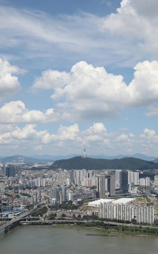 연일 무더위가 이어지고 있는 서울 지역에 장마전선이 힘을 쓰지 못하면서 18일 서울 여의도 63스퀘어에서 바라본 하늘에 흰 구름이 떠 있다. 장마는 19일 남부지방에 내리는 장맛비를 마지막으로 종료될 전망이다.