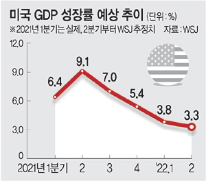 그러나 3분기부터는 GDP 성장률이 둔화할 것으로 예상됐다. WSJ의 3분기 GDP 추정치는 7.0%, 4분기 추정치는 5.4%까지 하락했다. 특히 내년에는 GDP 성장률 둔화 속도가 더 빨라져 2022년 1분기 3.8%, 2분기 3.3%로 예상됐다. 마이클 페롤리 JP모건체이스 수석이코노미스트는 “미국 경제가 영원히 9%대의 성장을 할 것으로 봐선 안 된다”며 “성장 둔화는 정상적인 흐름”이라고 진단했다. 올해 전체로는 6.9%를 기록한 뒤 2022년에는 3.2%, 2023년에는 2.3%로 둔화가 예상된다.성장률 둔화에 따라 최근 급등하고 있는 인플레이션도 완화될 전망이다. WSJ는 지난 6월 5.4% 상승해 2008년 이후 가장 빠른 속도로 상승한 소비자물가지수(CPI)가 12월 4.1%까지 하락한 뒤 2022년 말에는 2.5%를 기록할 것으로 예상했다.