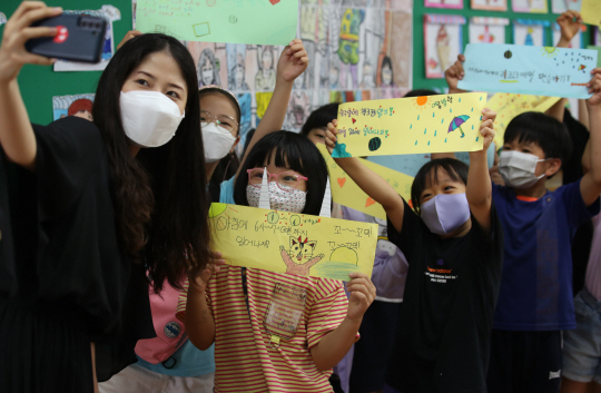 20일 광주 북구 문정초에서 3학년 학생들이 여름방학 동안에 할 자신의 약속을 적은 종이를 들고 선생님과 사진을 찍고 있다.