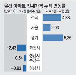전국적으로 전세난이 심화하고 있지만 경기 과천시, 성남시, 하남시 등의 아파트 전셋값은 하락하고 있다. 이들 지역은 입주물량 증가로 전셋값이 떨어진 만큼 전세난 해소를 위해서는 시장을 왜곡하는 정책 수정이 시급히 이뤄져야 한다는 지적이 나온다.