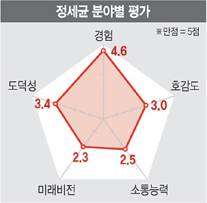 전문가들은 기업인 출신으로 6선 국회의원, 산업자원부 장관, 당 대표, 국회의장, 국무총리까지 ‘대통령 빼고 다 해봤다’는 정 전 총리의 다방면 정치 경력을 높게 평가했다. 3명이 경험 부문에서 만점을 줬다. 배종찬 인사이트케이 연구소장은 “국회의장 역임 후 관리능력을 인정받아 국무총리를 했으며 지역구 교체를 하며 국회의원을 했다”며 “정치적 관리 능력은 검증이 됐다고 봐야 한다”고 했다.