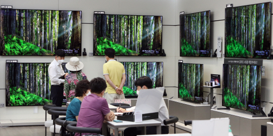 LG전자가 올해 상반기 생활가전 부문에서 매출 기준으로 미국 월풀을 제치고 1위에 올라선 가운데 22일 서울 영등포구 여의동 더현대서울에 있는 LG전자 베스트샵에서 직원들이 제품을 안내하고 있다.