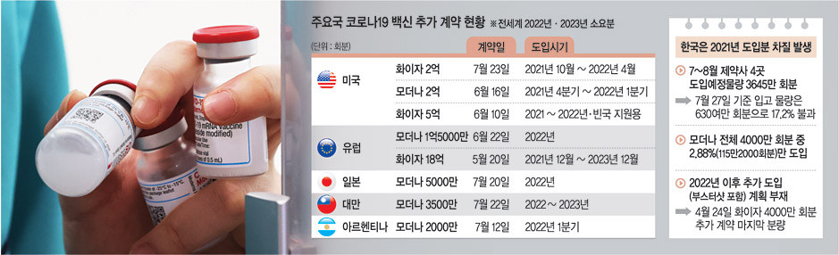 27일 정부의 백신 도입계획 등에 따르면, 한국의 마지막 백신 계약은 지난 4월 24일 화이자 백신 4000만 회분 추가분이다. 이 백신은 현재 부스터샷이라기보다는 모더나 백신 수급이 차질을 빚으면서 당장 접종사업으로 쓰이고 있다. 정부가 올 2분기부터 들어온다고 강조했던 모더나 백신은 현재까지도 전체 물량의 3% 미만만 들어오는 데 그쳤기 때문이다. 우리나라가 눈앞의 문제 해결에 급급한 사이 세계 각국은 지난해와 같이 벌써 내년 및 내후년의 백신 확보에 나서고 있다. 유럽연합(EU)은 올해부터 2023년까지 18억 회분의 화이자 백신 공급 계약을 지난 5월 체결했다. 화이자는 지난 23일에도 미국 정부에 2억 회분을 추가로 공급하겠다고 발표했으며, 일본은 모더나로부터 2022년에 5000만 회분을 공급받기로 했다. 지난해에도 백신 선진국들은 7월쯤 이미 충분한 양의 백신 공급을 확보한 바 있다. 지난해에 비춰봐도 이미 내년 도입 백신 확보에 적극 나섰어야 할 시점으로, 이대로 적기를 놓치면 올해와 같은 혼란이 내년에도 반복될 수 있다는 우려다.