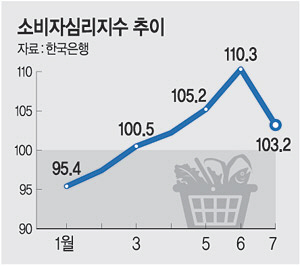 28일 한국은행이 발표한 ‘7월 소비자동향조사’에 따르면 올해 상반기 내내 상승세를 보이던 소비자심리지수(CCSI) 구성 6개 항목(현재 생활형편·생활형편전망·가계수입전망·소비지출전망·현재 경기판단·향후 경기판단)이 모두 감소세로 돌아섰다. 감소 전환은 코로나19 3차 대유행이 있었던 지난해 12월 이후 처음이다. 지난 2분기 우리 경제 성장이 소비 회복에 크게 의지했다는 점에서 CCSI 하락 반전을 가볍게 볼 수 없다. 2분기 성장률 0.7%를 달성하는 데 민간소비의 성장 기여도가 1.6%포인트로 가장 높았다. 소비 심리가 급격히 위축될 경우 향후 경제 회복 동력이 타격을 받을 수 있다.