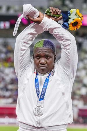 1일(현지시간) 2020 도쿄올림픽 육상 여자 투포환 결선에서 2위를 기록해 은메달을 거머쥔 미국 국가대표 레이븐 손더스(25·사진)의 ‘액세서리’들이 그야말로 “센세이션(돌풍)을 일으켰다”고 워싱턴포스트(WP)가 전했다. 마지막 포환을 던진 후 여유로운 표정으로 경기장을 거닐던 그는 성조기를 휘두른 채 카메라를 향해 여러 포즈를 취하고, 심지어 ‘트월킹(엉덩이춤)’까지 선보였다. 그러나 정작 가장 많은 스포트라이트가 쏟아졌던 시상대 위에선 손더스의 얼굴에 웃음기가 싹 가셨다. 단호한 얼굴로 정면을 쏘아보던 그녀는 두 팔을 머리 위로 들어 올려 X자를 그렸다.