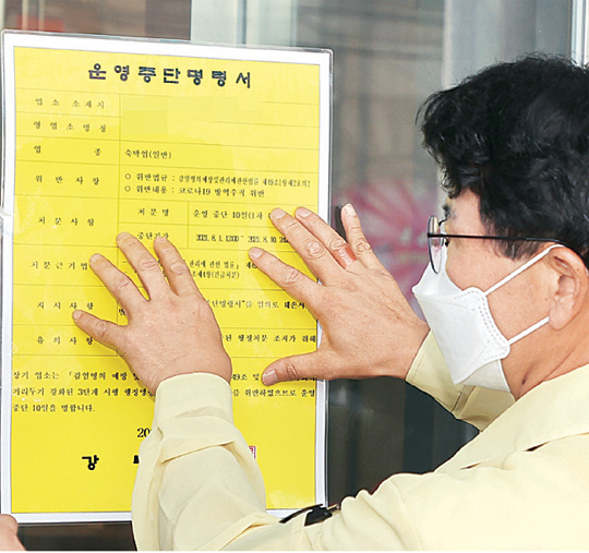 김한근 강릉시장이 1일 코로나19 방역수칙을 위반해 전일 저녁 실내에서 술과 음식을 곁들인 비키니 수영장 모임행사(풀 파티)를 가진 강릉 주문진의 한 호텔 현관 유리문에 영업정지 10일 행정명령서를 부착하고 있다.